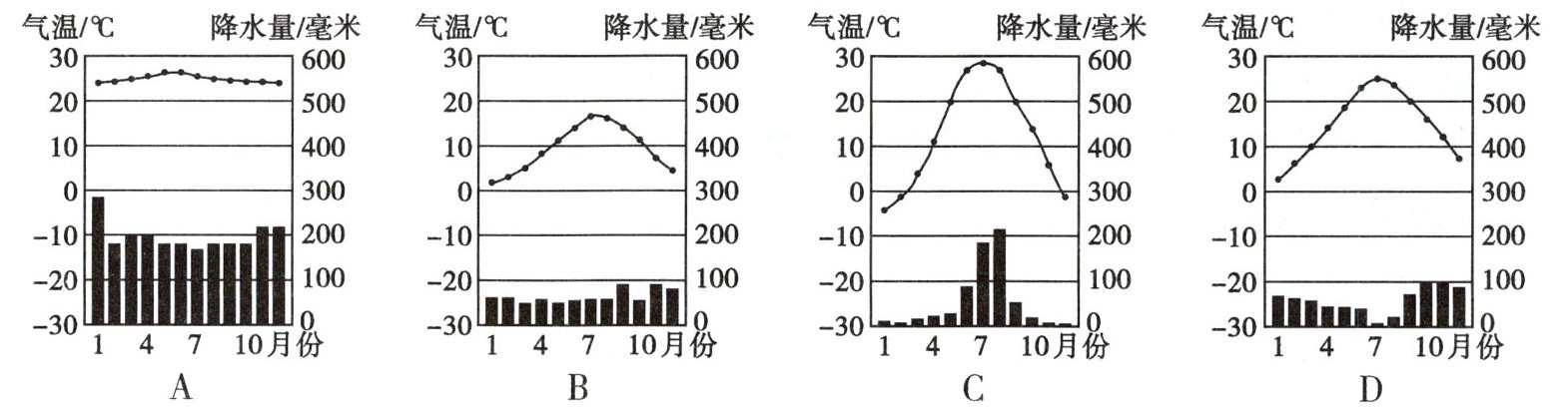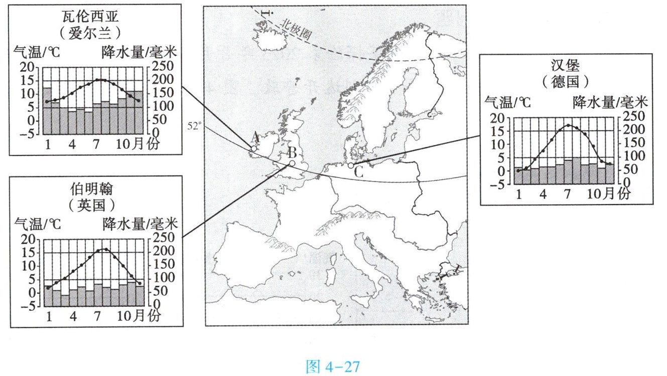 图4-27为欧洲西部示意图及瓦伦西亚、伯明翰、汉堡三城市气候统计图。据此完成3~4题。