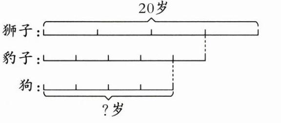1. 狮子的寿命是 20 岁,豹子的寿命是狮子寿命的$\frac{3}{4}$,狗的寿命是豹子寿命的$\frac{4}{5}$。狗的寿命是多少岁?(先画图,再解答)