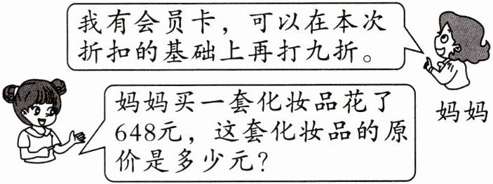 解:设这套化妆品的原价是x元。 x×90%×90%=648 x=800 答:这套化妆品的原价是800元。