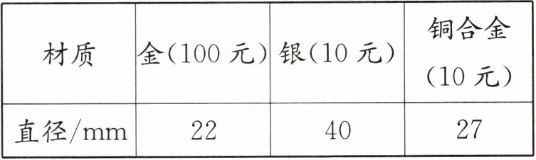 金:3.14×22=69.08(mm) 银:3.14×40=125.6(mm) 铜合金:3.14×27=84.78(mm) 答:金币的周长是69.08毫米,银币的周长是125.6毫米,铜合金币的周长是84.78毫米。