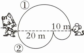路线①:3.14×(20+10)÷2=47.1(m) 路线②:3.14×20÷2+3.14×10÷2=47.1(m) 47.1=47.1 答:两条路线同样近。