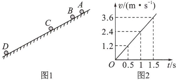 (选填“加速”“减速”或“匀速”)运动。(2) 为进一步探究小球在斜面上运动的速度与时间的关系,根据所测数据作出了 $ v - t $ 图像,如图 $ 2 $ 所示,假设斜面足够长,小球从 $ A $ 处滚下,经过 $ 2s $ 到达 $ E $ 点时的速度为