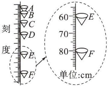 7. 在测量纸锥下落速度的实验中,小明用每隔 $ 0.5s $ 拍摄 $ 1 $ 次的相机,拍得如图所示的照片,右侧为纸锥从 $ E $ 到 $ F $ 过程的放大图。