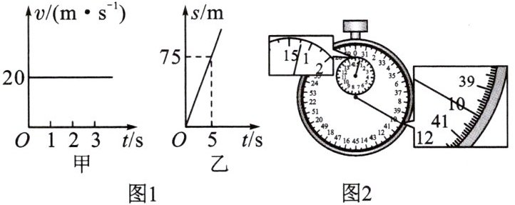 10. 甲、乙两辆汽车在平直路面从同一地点同时同向运动,甲汽车的 $ v-t $ 图像和乙汽车的 $ s-t $ 图像如图 1 所示,运动的时间如图 2 秒表所示,最终甲、乙汽车相距