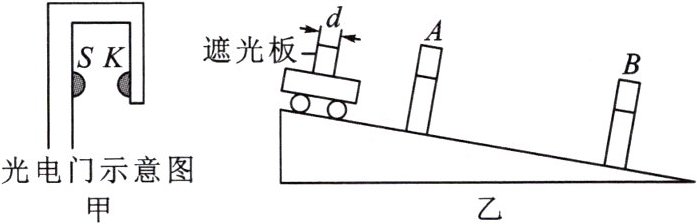 11. 光电门是物理实验中用来测量时间的一种常用设备,如图甲所示,$ S $ 是光源,$ K $ 是光接收器,当有不透明物体通过光电门时,物体会遮住光源,接收器 $ K $ 接收不到光信号,计时器便开始计时,当物体通过后,接收器 $ K $ 重新接收光信号,计时结束,即可记录物体通过光电门所用的时间。如图乙所示,某同学用光电门测量小车沿斜面向下运动的速度,小车上安装有遮光板,$ A $、$ B $ 是安装在斜面上不同位置的两个光电门。