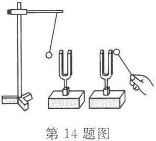 14. 如图所示,用橡皮槌去敲击右边的音叉,左边的音叉也能发声并把泡沫塑料小球弹起。若将该装置搬至月球上做实验,泡沫塑料小球