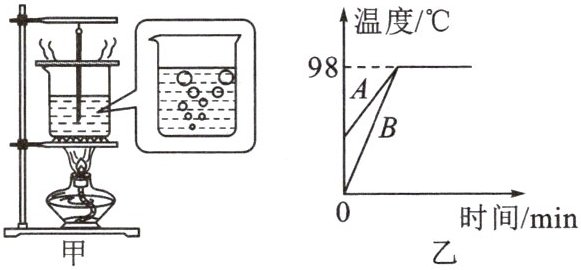 (3)小兰和小伟根据各自的实验数据绘制出水温随时间变化的图像分别如图乙中$A$、$B$所示。由图像可知,小兰和小伟所用水的质量大小关系是$m_{A}$