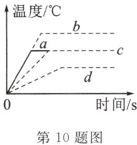 10. 用同一热源给一定质量的水加热,其温度与时间的关系如图中图线$a$所示。若相同时间内水吸收的热量相同且其他条件不变,对于以下三种情况,实验中记录了温度与时间的关系图线为$b$、$c$、$d$,则$b$曲线对应