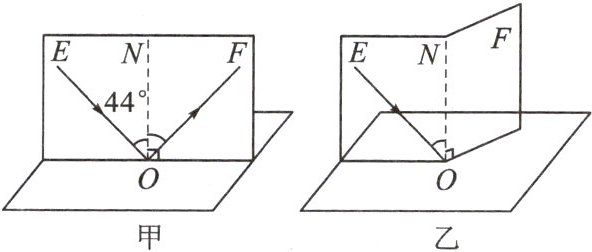 度。(4) 如图乙所示,将纸板 $NOF$ 向后折,在纸板 $NOF$ 上