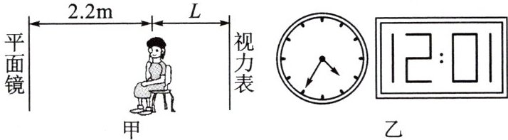 12. 检查视力时,视力表放在被测者头部的后上方,通过识别对面墙上镜子里的像来完成检查(如图甲所示)。若要求被测者眼睛与视力表像的距离为 5m,则 L 的大小为