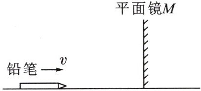 10. 如图所示,平面镜 M 直立在水平地面上,长 6cm 的铅笔平放在地面上且与平面镜垂直,笔尖离平面镜 10cm,现铅笔以 2cm/s 的速度垂直平面镜向它匀速靠近。则(