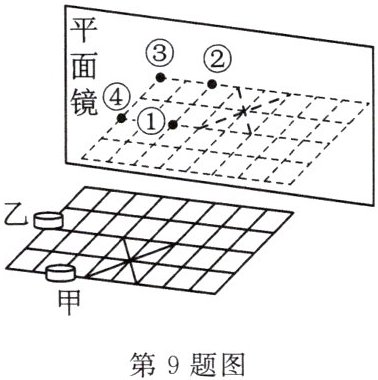 9. 如图所示,在中国象棋棋盘正中央竖立一块垂直于棋盘的平面镜,棋子“象”由甲移到乙,则平面镜中“象”的移动是(