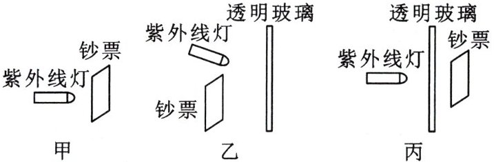 。(3)如图丙所示,他把这块透明玻璃放在紫外线灯和钞票之间,让紫外线灯正对玻璃照射,在另一侧无论怎样移动钞票,“100”字样都不发光。他做这次实验是为了探究