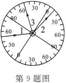 9. (宜昌市中考)在“探究光从玻璃斜射入空气的折射规律”的实验中,小东借助激光笔、半圆形玻璃块和带刻度的光具盘完成了实验,观察到如图所示的$1$、$2$、$3$三条光束,并在光具盘上用笔描出了对应的光路。