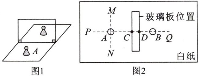 (2) 将棋子A置于玻璃板前方,观察到A的两个像,在玻璃板后方放置棋子B,使之与棋子A较亮的像重合。在白纸上记下棋子A和B的位置,如图2所示,此时物到镜面的距离为
