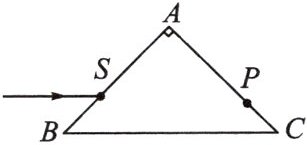 13. 如图所示,一玻璃三棱镜的横截面为等腰直角三角形ABC。一束红光平行于BC边从S点射入三棱镜,经AB面折射后,又在BC面发生反射,然后恰好从P点折射后射出。请画出这个传播过程的光路图。