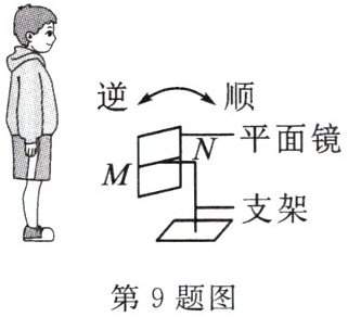 9. (镇江市中考)如图所示,竖直放置的平面镜能绕水平轴MN转动,小明站在平面镜正前方,他在镜中成的是
