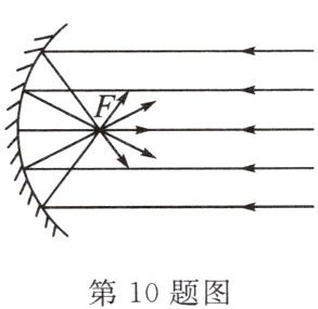 10. 如图是一束平行光射到凹面镜上的传播情况。现在有一点光源,若要利用凹面镜获得平行光,应把点光源放在