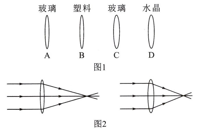 14. 【科学探究】某物理学习小组,选择如图1所示的四个透镜进行探究实验(其中A和B、C和D是两组形状相同的凸透镜,它们分别由玻璃、塑料和水晶制作而成)。