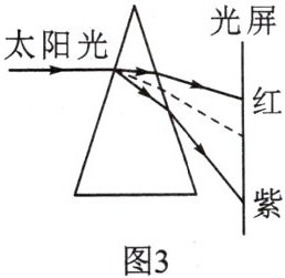 (2)有同学回想起太阳光经三棱镜后,光屏上自上而下依次出现了红、橙、黄、绿、蓝、靛、紫的色带,如图3所示。受此启发,他选取一个凸透镜,分别用红光和蓝光来进行图2的实验。你认为对于同一凸透镜,