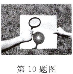 10. 在利用太阳光测量凸透镜焦距时,小华将凸透镜正对着太阳,再把一张纸放在它的下方,如图所示。当在纸上呈现一个并非最小的光斑时,测得这个光斑到凸透镜的距离为L,小华推断,凸透镜的焦距一定大于L。