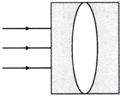 9. 如图所示,在一块玻璃砖内,一束平行光恰好正对着玻璃砖内椭圆形状的空气泡射去,则光束通过空气泡后(