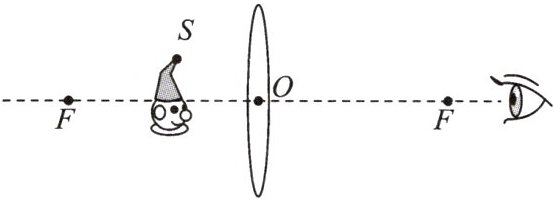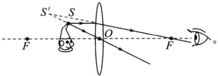 11. 小静在玩耍时透过爷爷的老花镜看到了小玩偶的像,请你在图中作光路图确定玩偶 $ S $ 点所成像 $ S’ $ 的位置。图中 $ O $ 为老花镜的光心,$ F $ 为其焦点。
