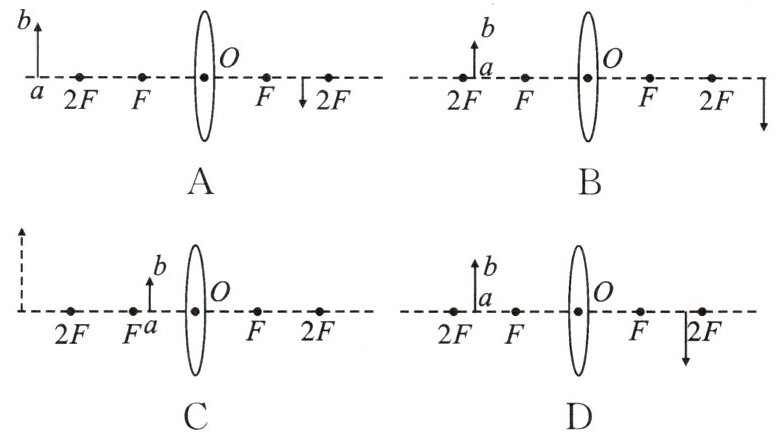 6.(宜昌市中考)如图所示是一种常见的投射灯,它的成像镜头可简化为一个凸透镜,能把投影片 $ ab $ 投射到地面,下图中能正确反映其成像原理的示意图是 (