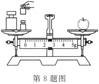 8. 小红同学要测量一个苹果的质量,测量方法如图所示,则由图可以看出小红同学在实验过程中出现的主要错误是: