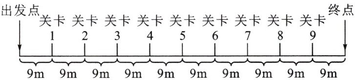 17.【科学思维】如图所示,某“小车闯关游戏”的笔直通道上每隔 9m 设有一个关卡,各关卡同步放行和关闭,放行和关闭的时间分别为 5s 和 2s,出发点到终点之间共有 9 个关卡。关卡刚放行时,一辆小车立即从出发点以 2m/s 的速度匀速前进,则小车经过