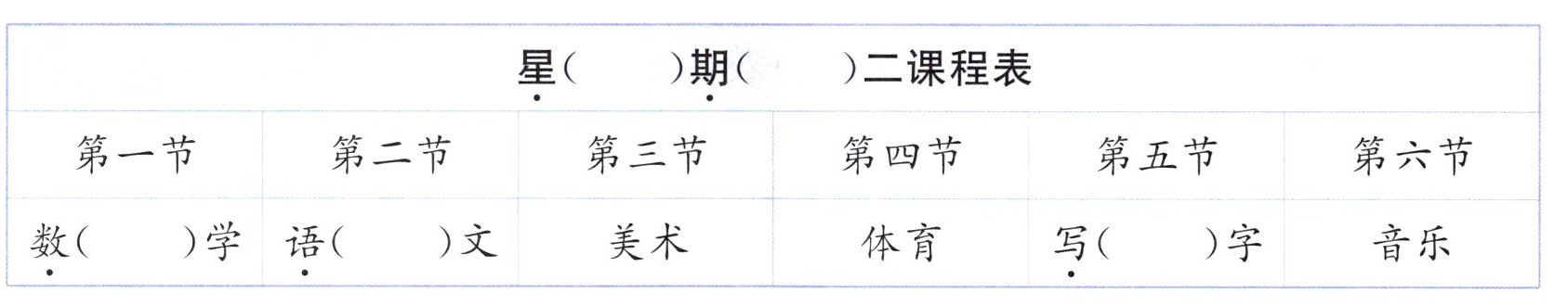 二、顺利进入学校后,小语给爸爸妈妈看了自己的课程表,请你帮她一起完成练习吧!