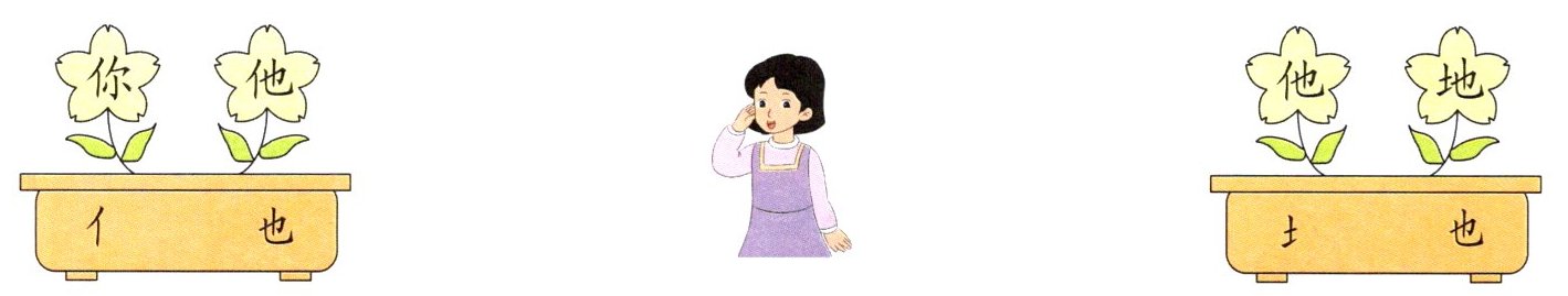 左边:亻 右边:也 解析:仔细观察给出的汉字,可以发现“你”和“他”都有“亻”,“他”和“地”都有“也”,把相同的部分圈出来即可。