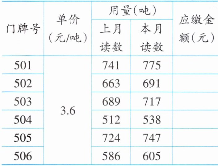 3. 下面是某层楼6户住户9月份的用水情况,算出每户应缴的水费,把它填在相应的表格中。
