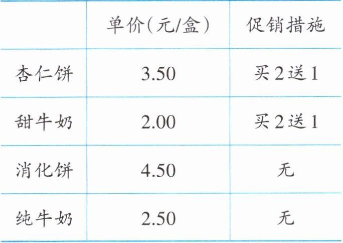 问题:买2盒甜牛奶和3盒消化饼,一共需要多少元?