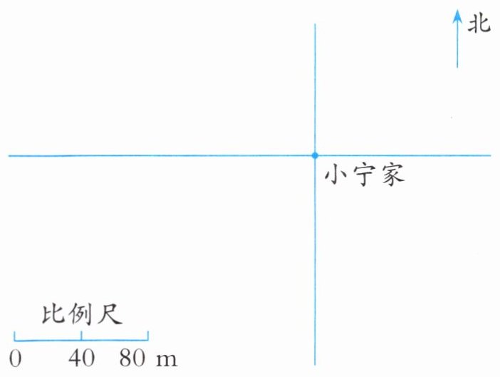 学校实际距离小宁家$160$米,图上距离为$160÷40 = 4$厘米,在小宁家正左方$4$厘米处标出学校。