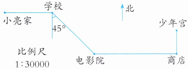 4. 六(1)班去郊外游玩,从学校出发到公园的路线如下所示。请按$1:60000$的比例尺画图。