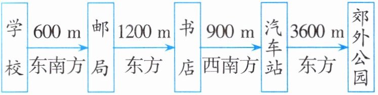 从一点开始,按方向“东南 - 东方 - 西南 - 东方”,依次截取图上距离$1cm$、$2cm$、$1.5cm$、$6cm$,标出学校、邮局、书店、汽车站、郊外公园的位置。