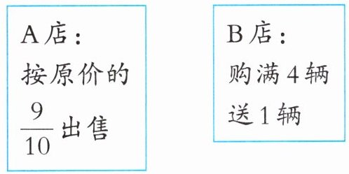 2. 乐乐和他的4个好朋友约好星期天到玩具店购买5辆相同的玩具车,玩具车的单价是20元。以下两家店,到哪家店购买合算?