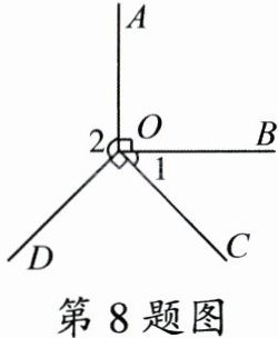 8. 如图,$ \angle AOB = \angle COD = 90^{\circ} $,则 $ \angle 1 $ 与 $ \angle 2 $ 的关系是(
