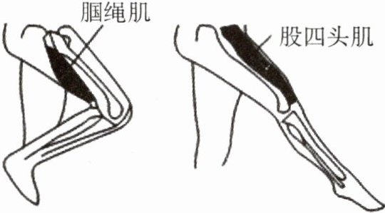 7. [威海中考] 踢毽子时要屈腿和伸腿,这两个动作主要由腘绳肌与股四头肌两组肌肉协调配合完成,如图所示。下列相关叙述正确的是(
