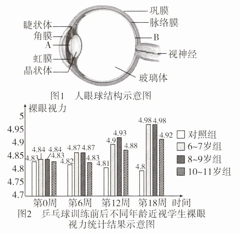 (3) 有人为了探究乒乓球运动对6~11岁近视儿童视力的影响,选取120名裸眼视力4.8左右的近视学生进行分组实验。实验组进行为期18周的乒乓球训练,定期测定对照组和实验组学生的裸眼视力,得到图2所示结果。