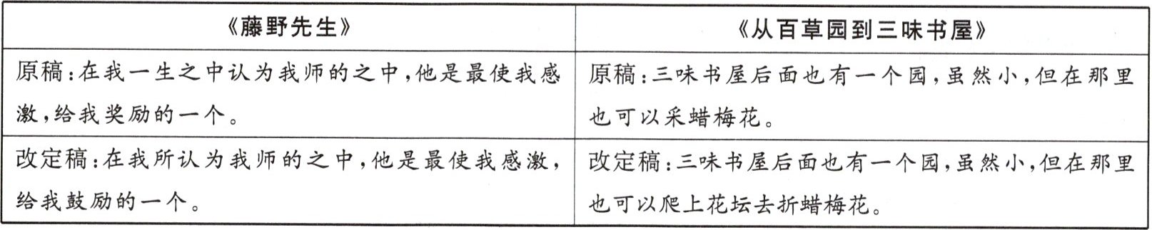 《藤野先生》:将“在我一生之中认为我师的之中”改为“在我所认为我师的之中”,删繁就简,语言变得更为简洁精练;将“给我奖励”改为“给我鼓励”,悉心斟酌,表意更准确严密。《从百草园到三味书屋》:将“但在那里也可以采蜡梅花”改为“但在那里也可以爬上花坛去折蜡梅花”,添加具体动作“爬上花坛”,更加生动形象;将“采”改为“折”,用词更加准确,表现出孩子活泼好动的特点。