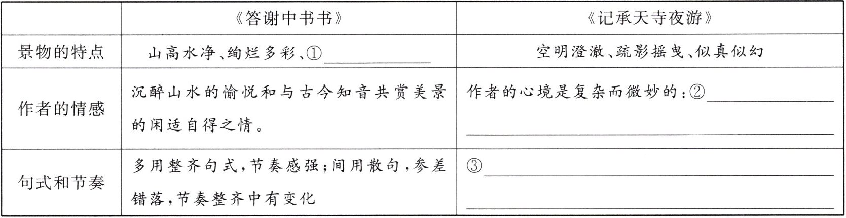 ①充满生机 ②有贬谪的悲凉,有赏月的欣喜,有人生的感慨,有漫步的悠闲 ③多用散句,间用整齐句式,节奏舒缓,不求统一,散淡自然