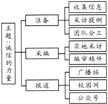(1)示例:本次采访报道活动以“诚信的力量”为主题,分为准备、采编和报道三个阶段。在准备阶段,需要收集采访对象信息、拟定采访提纲并做好团队分工;在采编阶段,先进行实地采访,再编审稿件;最后通过广播站、校园网、公众号进行宣传报道。