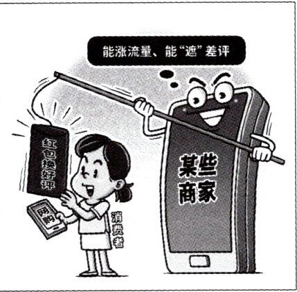 漫画反映了某些商家通过发放现金红包,吸引消费者给予商品好评的现象,讽刺了一些人为追求个人经济利益,而违背诚信原则的行为。