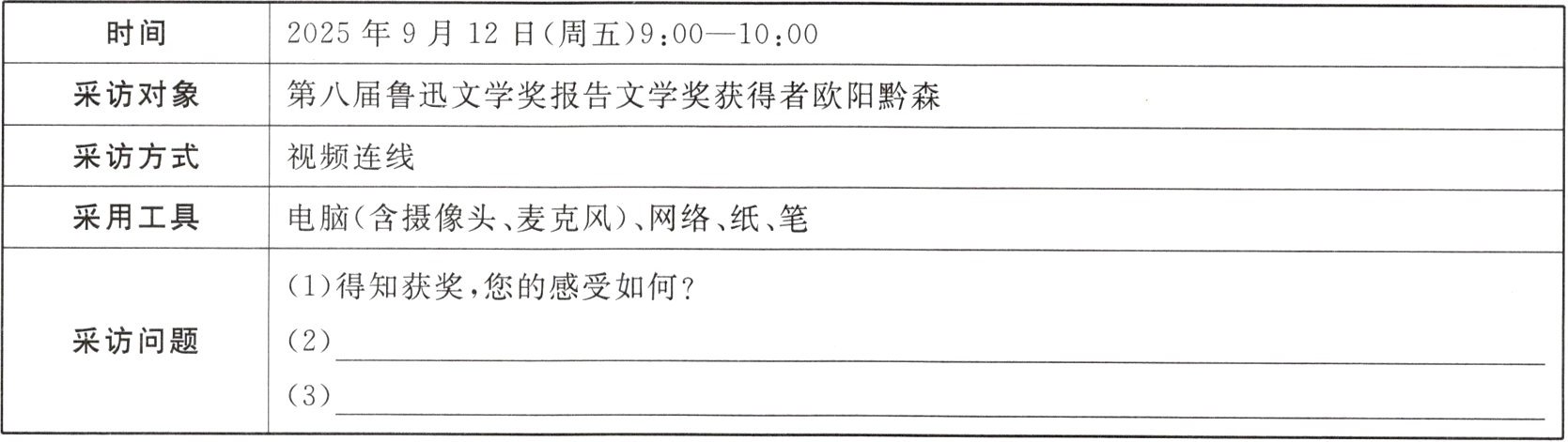 5. 你所在的班级拟开展“与文学有约”采访实践活动。请你结合文本二的内容,补全下面的采访提纲。