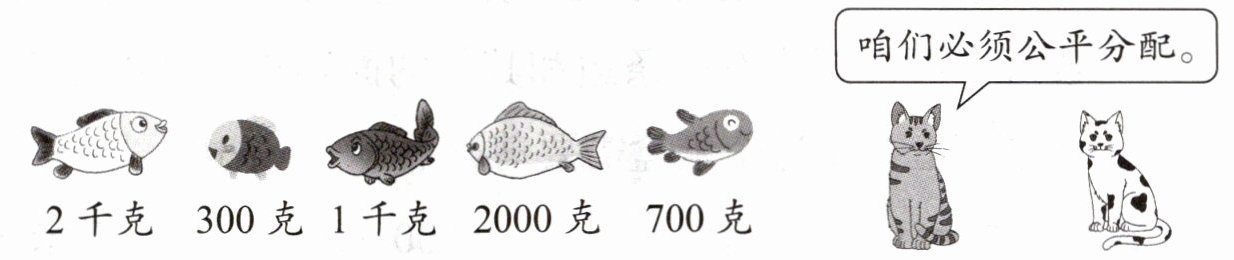 一只猫分2千克和1千克的鱼,另一只猫分300克、2000克和700克的鱼,每只猫都分到3千克鱼。
