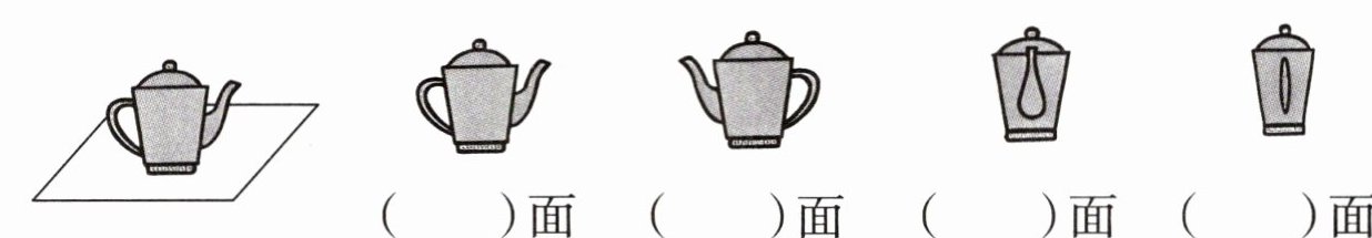 1. 小刚给下面的茶壶画了四幅画,请将画每一幅图时所站的位置填在相应的括号里。