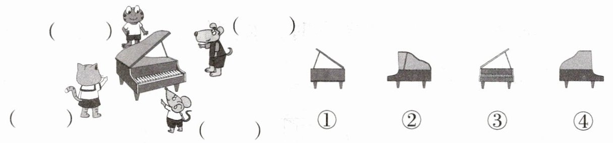 4. 小青蛙邀请朋友们参加音乐会,会后他们围着钢琴交谈,那么每个小动物眼中的钢琴形状是右边几号图形?将序号填在括号里。