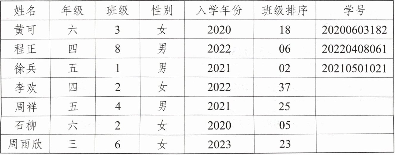 |姓名|年级|班级|性别|入学年份|班级排序|学号|